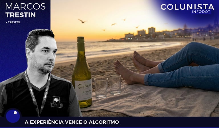 Uma inteligência artificial do telefone sugeriu, com entusiasmo artificial, outros restaurantes melhor avaliados nas proximidades. Recomendava vistas panorâmicas, playlists certas, experiências otimizadas. Nenhuma delas incluía sentar na areia, sentir o frio subir pelos pés ou disputar espaço com uma gaivota curiosa que se aproximou, avaliando se aquele vinho tinha potencial gastronômico para ela também. Mostrei a sugestão para minha esposa. Concordamos em silêncio: nenhum algoritmo entende quando o foco é simplesmente estar.