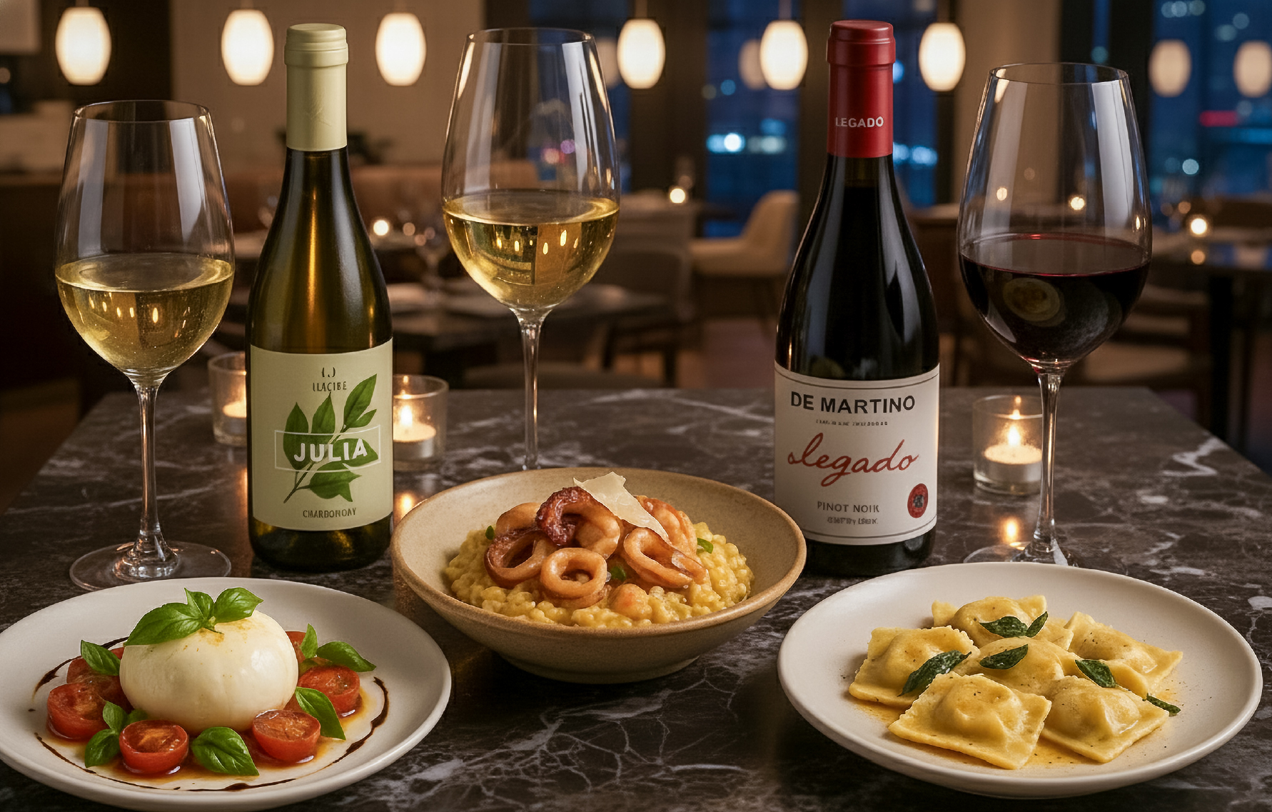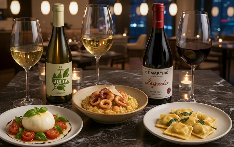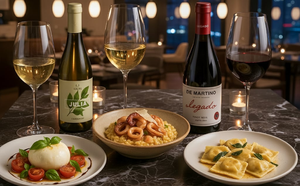 🍷 Julia Chardonnay, Itália — branco elegante, de corpo médio, com notas de pera madura, maçã verde e leve toque mineral; acidez equilibrada que realça a cremosidade da burrata e o frescor da salada caprese. Preço estimado R$ 115,00