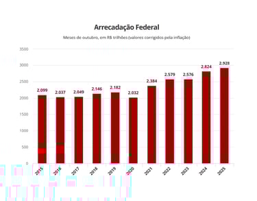 Ao considerar os valores corrigidos pela inflação, a arrecadação alcançou R$ 2,93 trilhões em 2025, frente aos R$ 2,82 trilhões registrados em 2024. Essa comparação indica um crescimento real de 3,65% no período, mesmo após um desempenho elevado no ano anterior.