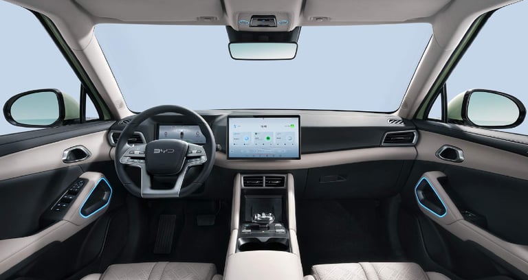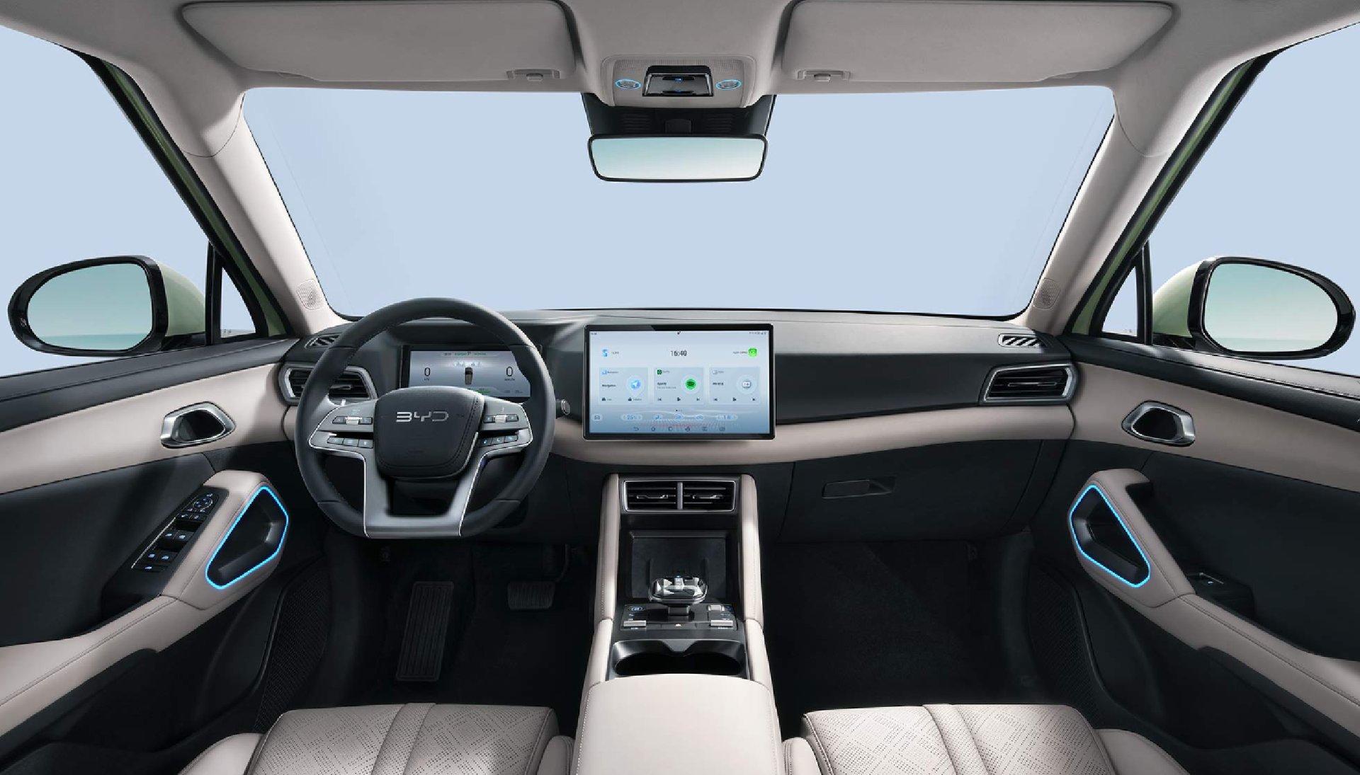 No interior, a aposta é na tecnologia e no conforto. O painel de instrumentos é totalmente digital, com uma tela de 8,8 polegadas e grafismos configuráveis. O grande destaque, porém, é a central multimídia flutuante e giratória de 12,8 polegadas, um cartão de visitas dos modelos BYD, que integra funções como espelhamento de celular (Apple CarPlay e Android Auto sem fio) e as imagens da câmera panorâmica 3D de 360º, essencial para manobras e segurança. Os bancos, com ajustes elétricos e design ergonômico, garantem conforto aos ocupantes.